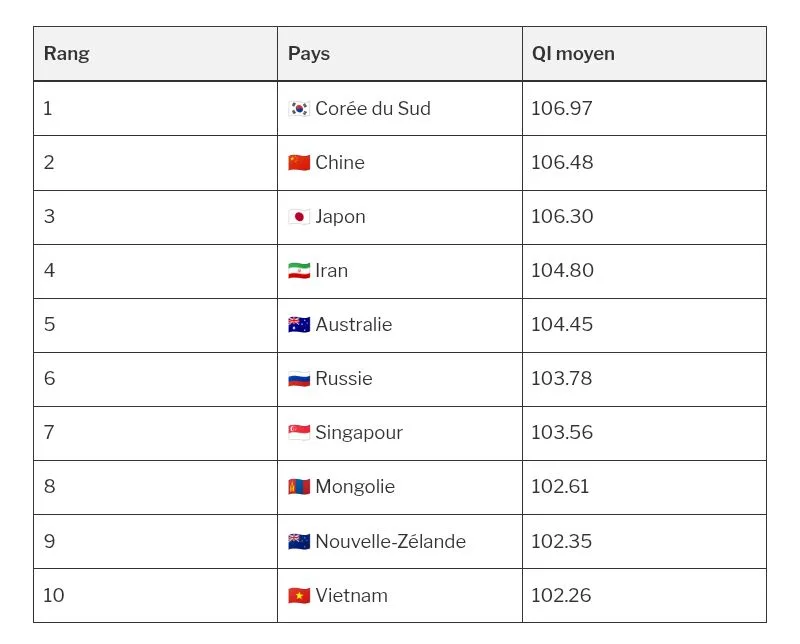 Le classement mondial 2026 des pays par QI moyen, publié par International IQ Test (mise à jour du 1er janvier 2026, basé sur plus de 1,2 million de participants), place la Corée du Sud, la Chine et le Japon en tête. Ces pays affichent des scores moyens supérieurs à 106, suivis par l’Iran, l’Australie et la Russie. La France, quant à elle, se situe à la 27ᵉ place avec un QI moyen de 100,12.